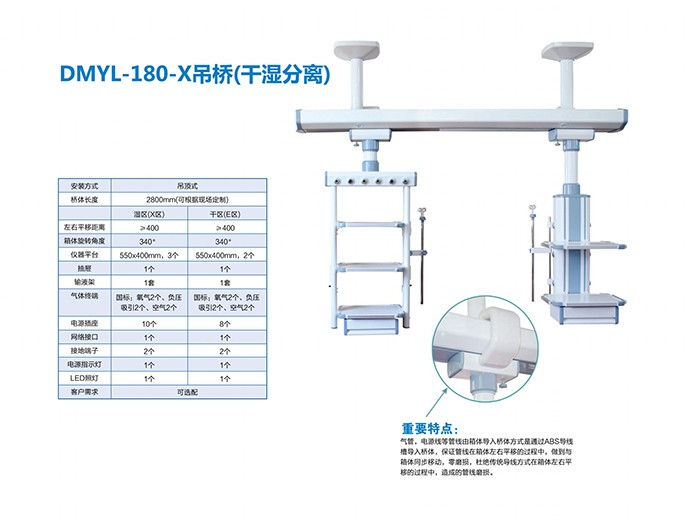 接著,我們?yōu)榇蠹彝扑]山東德曼醫(yī)療生產(chǎn)的心血管內(nèi)科CCU醫(yī)用吊塔。在監(jiān)護(hù)病房中,通常會使用醫(yī)用吊橋,因?yàn)檫@種吊橋是一個(gè)橫梁,兩側(cè)分別帶有箱體,從而為放置監(jiān)測儀器提供了更多的空間和位置。吊塔上還可提供氣體等,可根據(jù)病房的實(shí)際需求進(jìn)行選擇,箱體上還配備了電插口,為監(jiān)測儀器和設(shè)備提供電源。
